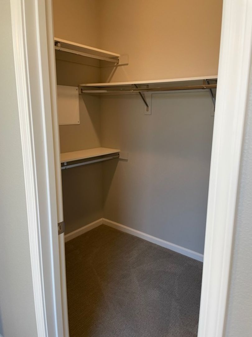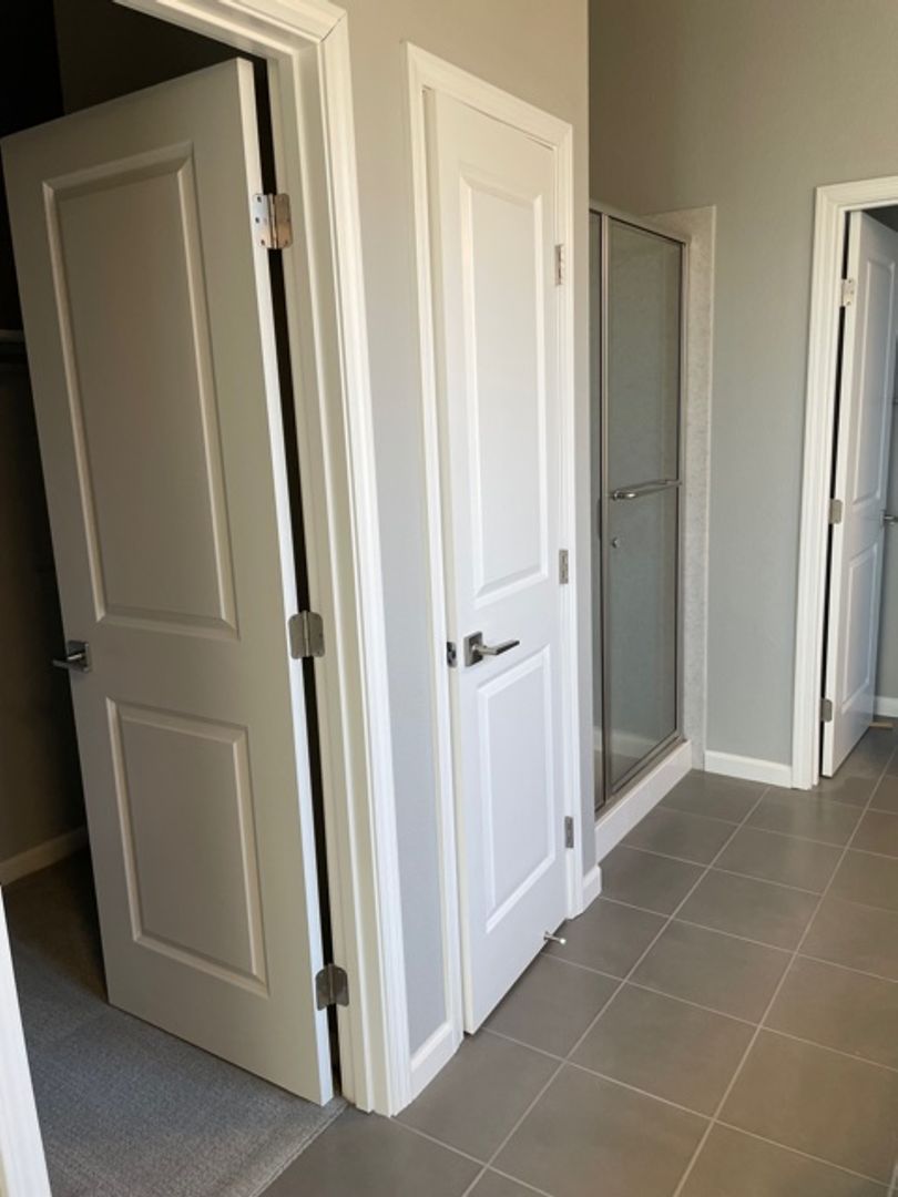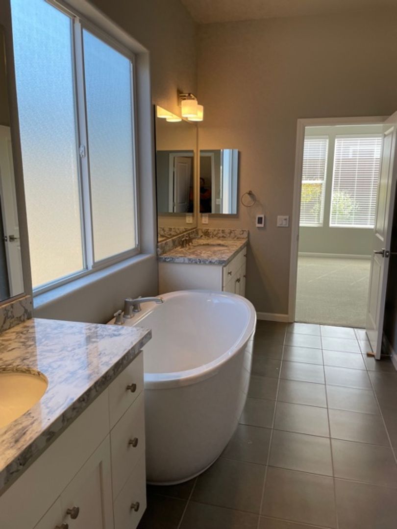 The large, bright master suite bathroom has two generous separate vanities with quartz counters and a free standing bathtub between. Radiant heat tile floor and a walk in closet create a luxurious private space. Two other bedrooms both with walk in closets share the 2nd bathroom on the opposite side of the house.